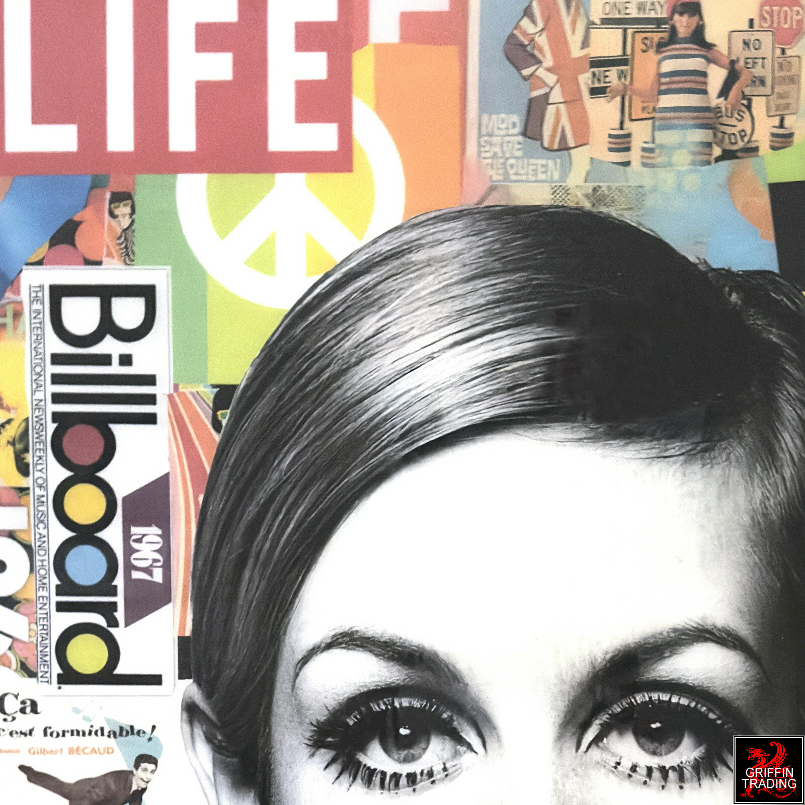 This vibrant piece pays homage to the iconic Twiggy from the 1960s fashion era. Blending the timeless elegance of a black-and-white portrait with colorful, nostalgic magazine clippings and pop art influences, a must-have for fans of classic pop culture and contemporary design. The striking image of Twiggy blowing bubble gum evokes the playful spirit of the Swinging Sixties. The background features clippings of LIFE Magazine, Billboard, The Beatles and even a classic Vespa ad.