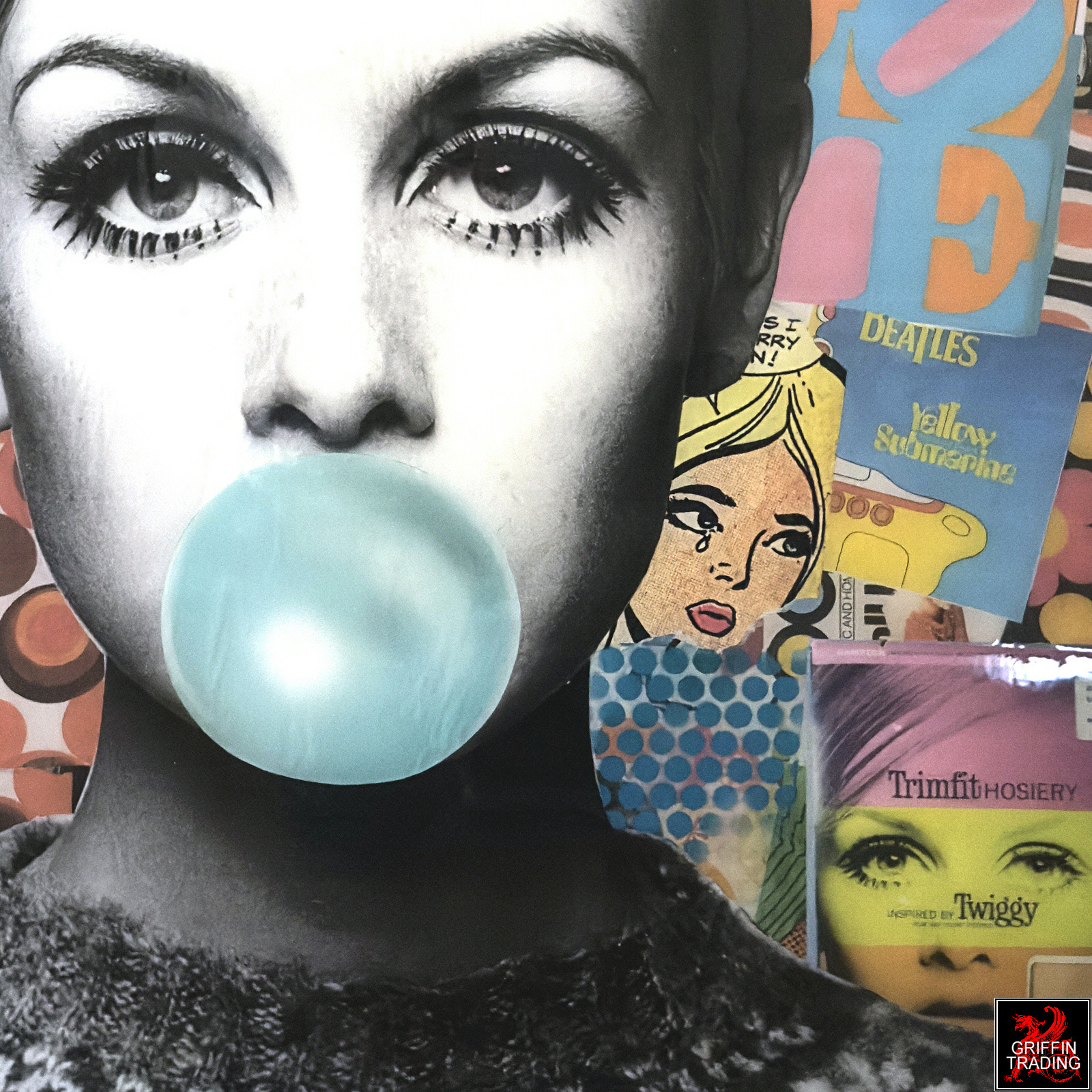 Add a touch of retro charm and bold pop culture energy to your collection with “Bubble Gum Twiggy,” an original mixed media artwork available exclusively at Griffin Trading.