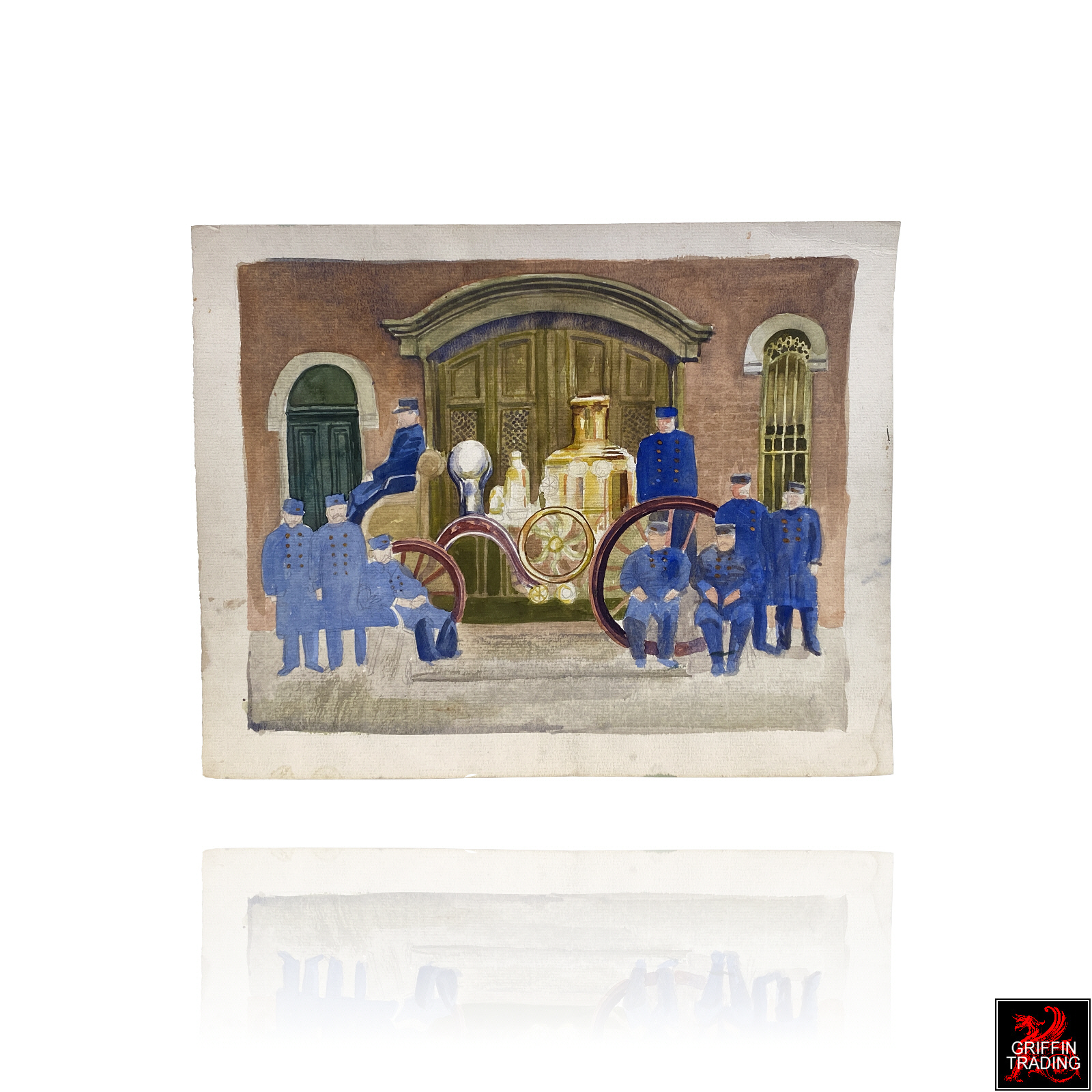 This watercolor painting is part of a group of watercolor, acrylic and oil paintings that come directly from the artist estate. The painting, like most of his paintings, was inspired by a photograph the artist owned or found. Some of his paintings are images of the past, found in books or historical archives. We believe this image was just that, an early 1890’s photograph featuring the Firemen and Fire Truck in front of their Firehouse. Classic Americana.