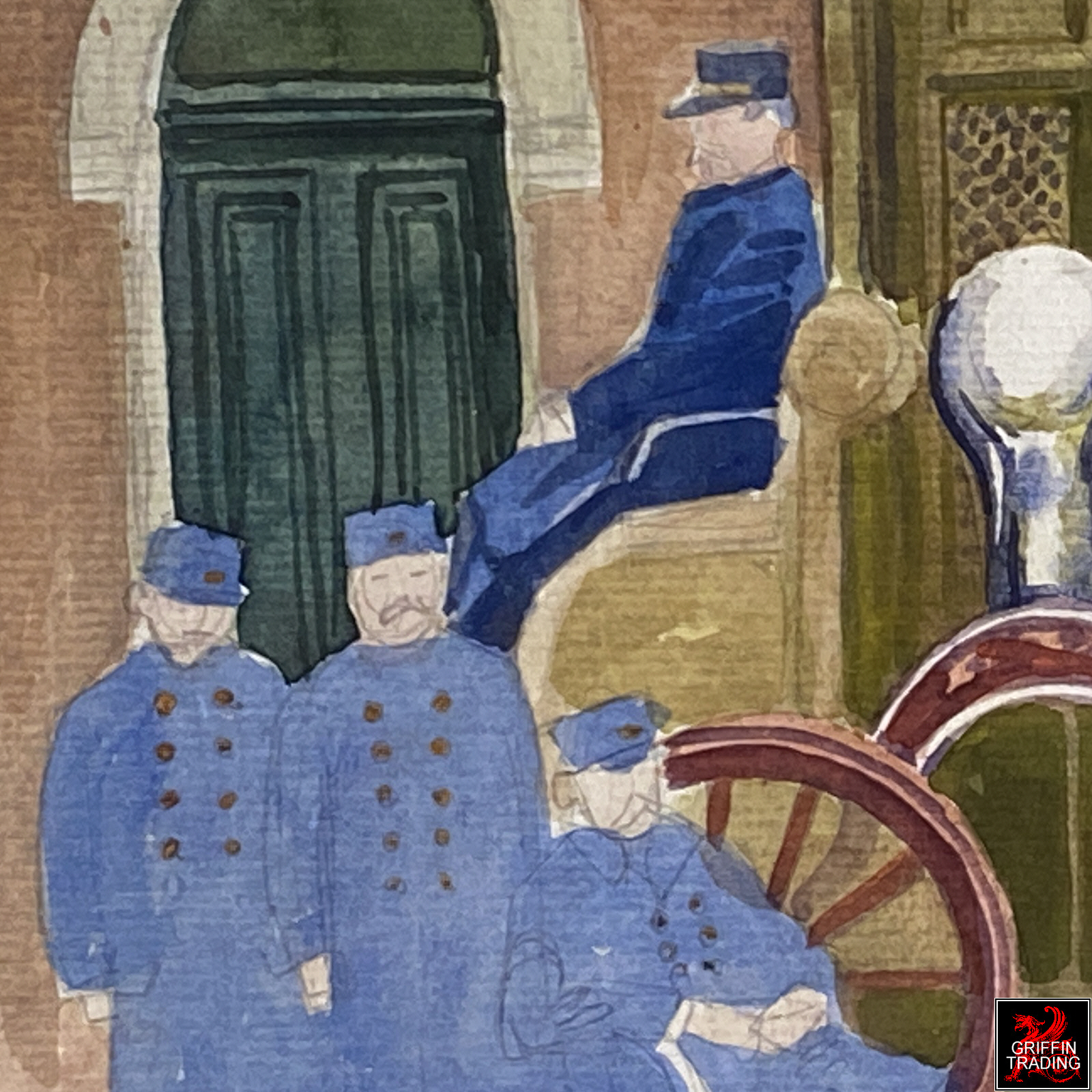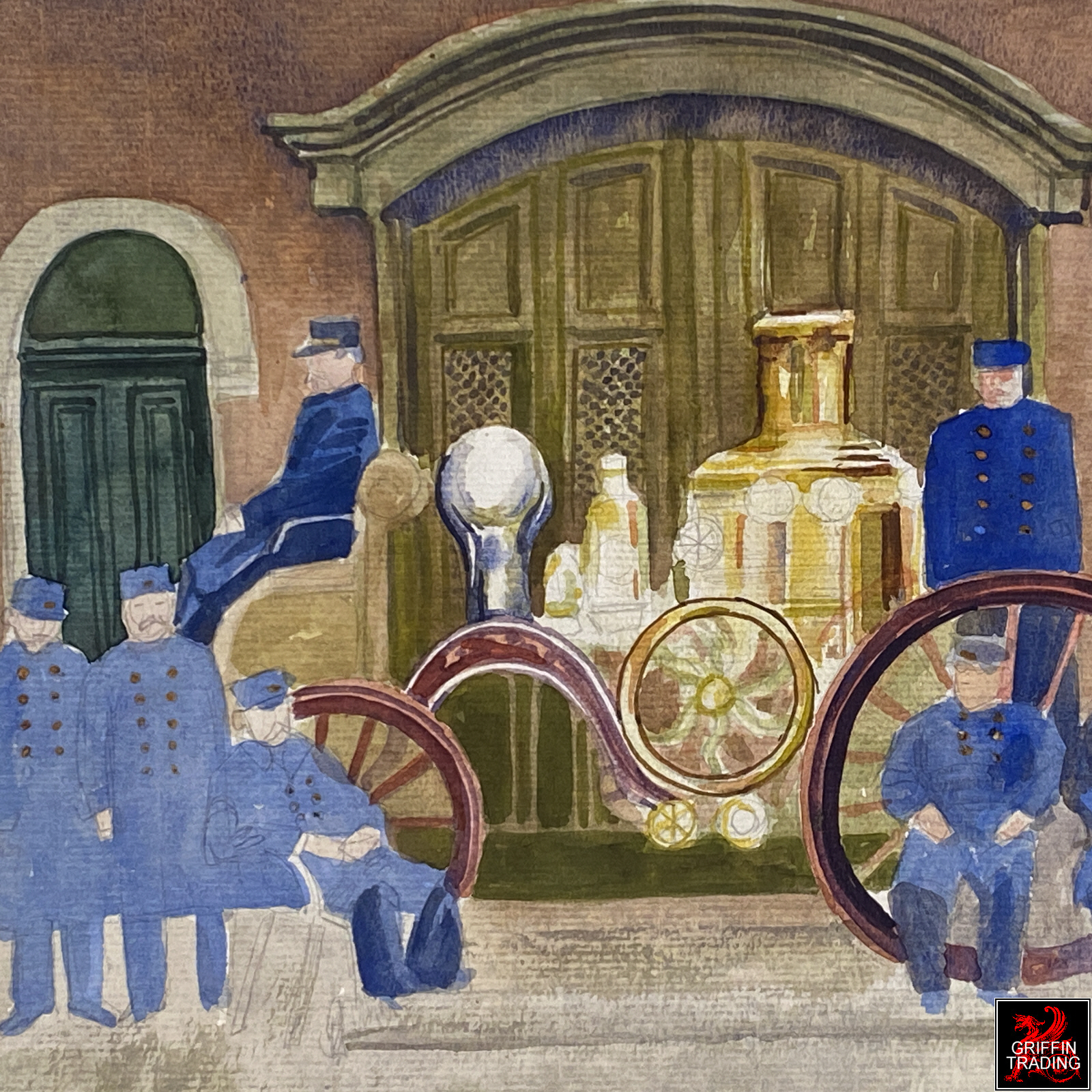 This New York Fire Brigade painting is an original watercolor featuring a classic image of a group of Firemen in front of an early Firehouse. We love the way the crew are all pictured in front of their horse drawn fire pump wagon or fire engine. The painting was done by Nik Puspurica and may be an unfinished work or study, as it is unsigned. The hinted details of the early 1890’s fire pump wagon and the golden brass color of the steam boiler, are spectacular.